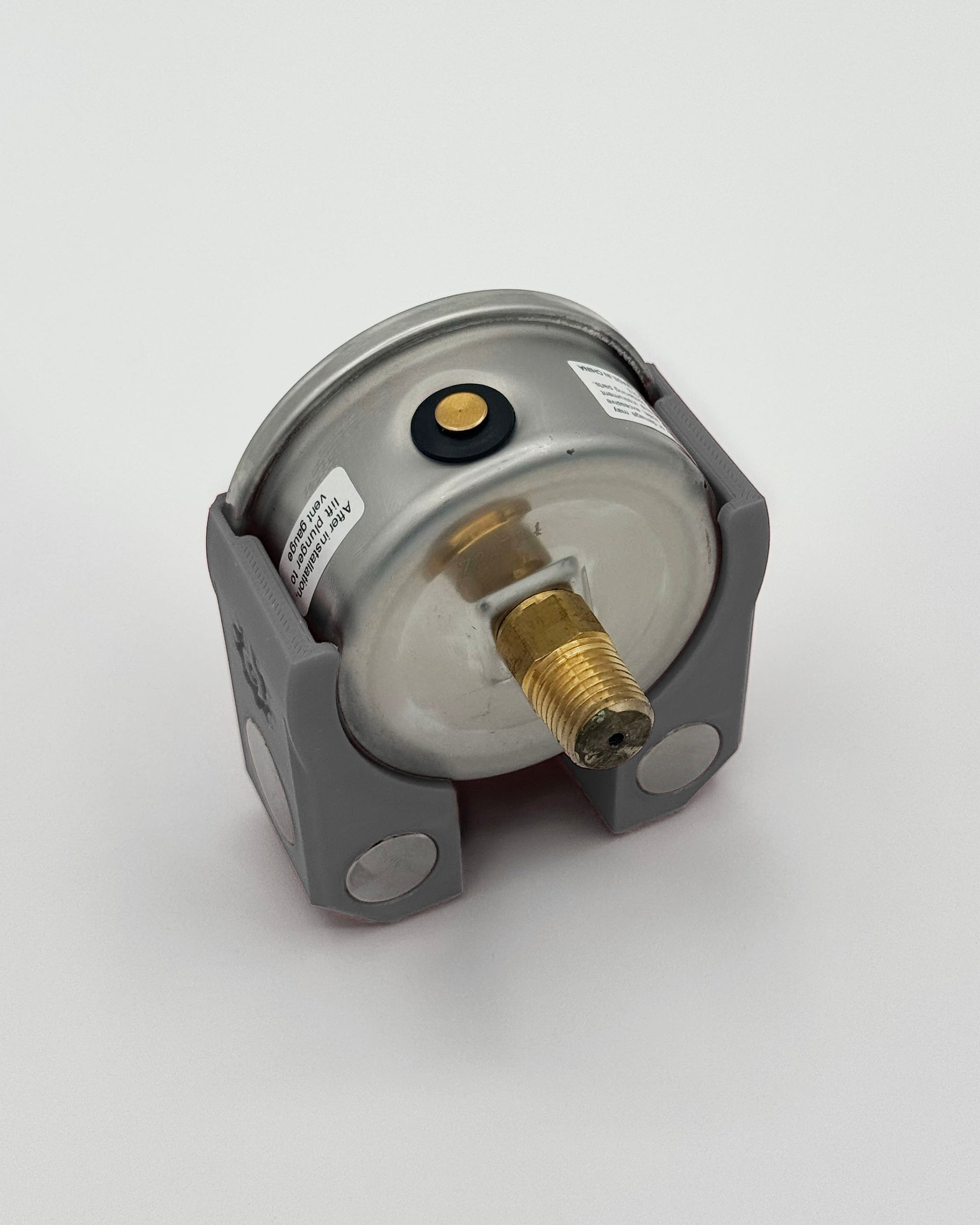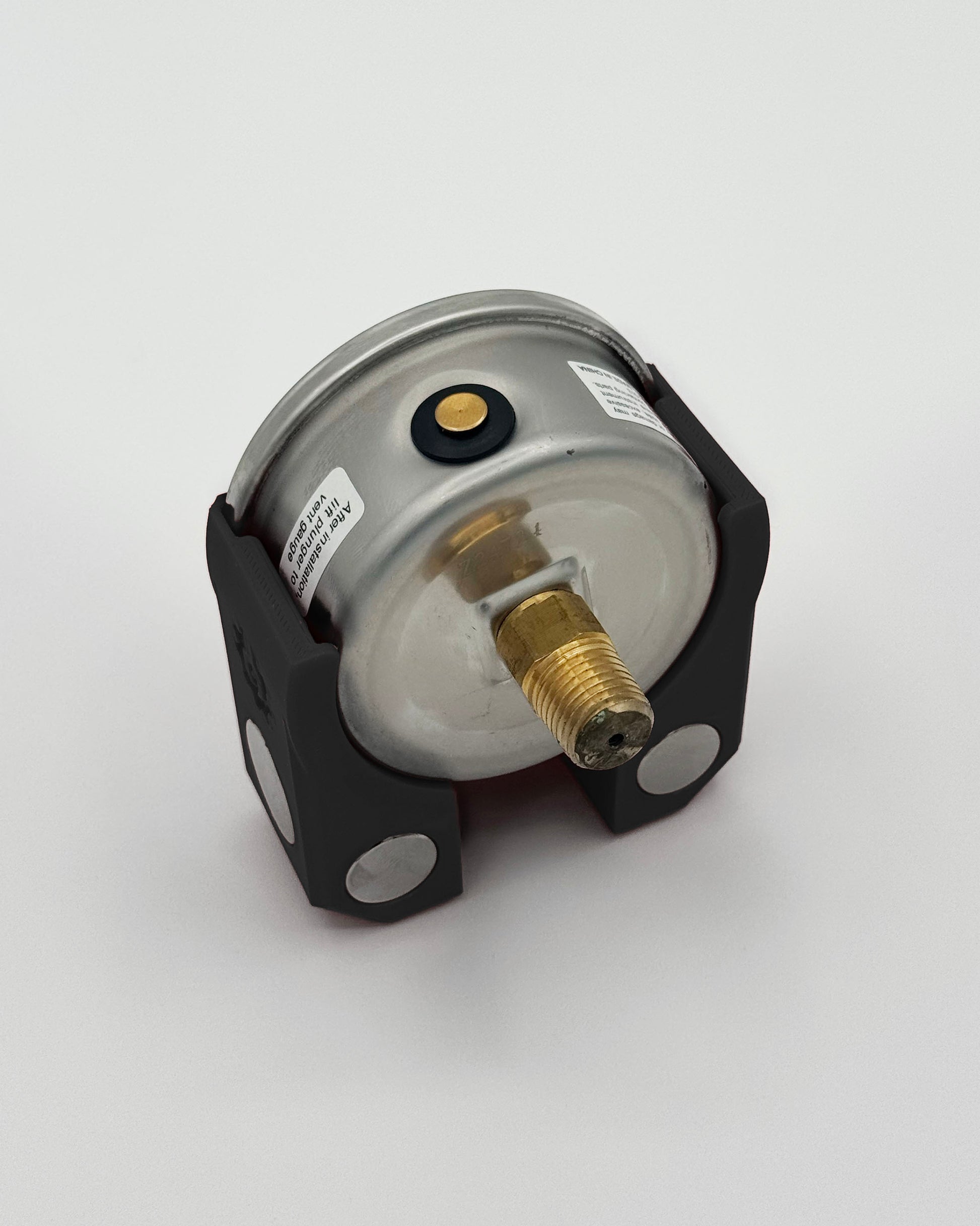 GaugeBuddy is a universal magnetic mount for hydraulic gauges and is designed to keep your readings visible, stable, and hands-free while you work. It snaps securely into place and attaches directly to metal surfaces, eliminating the need to hang gauges from hoses or awkwardly balance them on machinery.